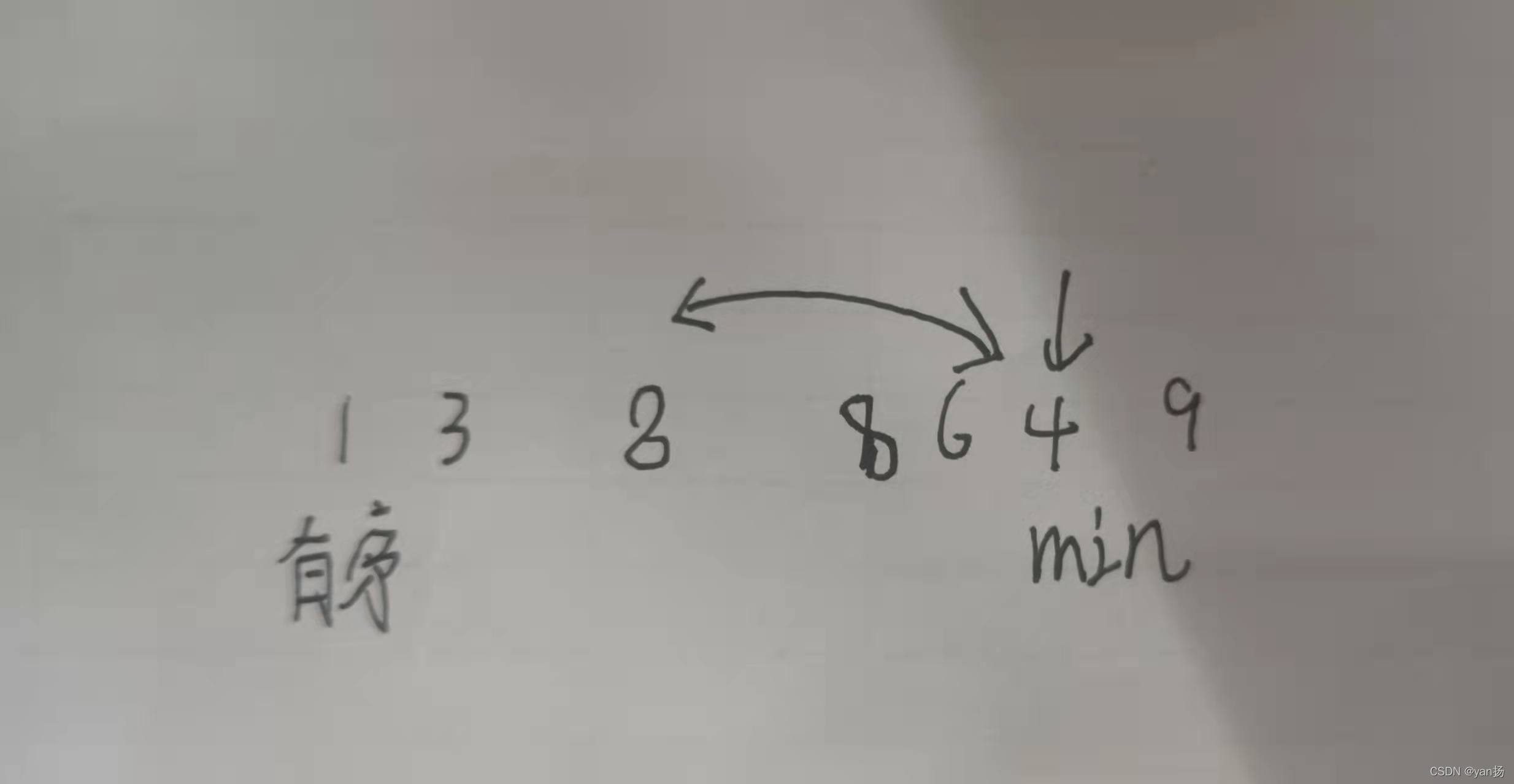**如图所示 我们每次从无序区间内选择最小的数和无序区间第一个数交换 此时无序区间最小的值是4 那么他就应该和8交换 而这两个8的位置就互换了 因此选择排序不具有稳定性 **