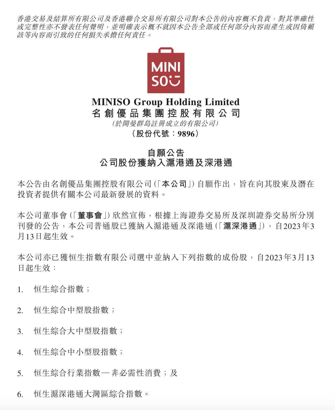 3月13日,名创优品发布公告称,公司普通股已获纳入沪港通及深港通,自2023年3月13日起生效。