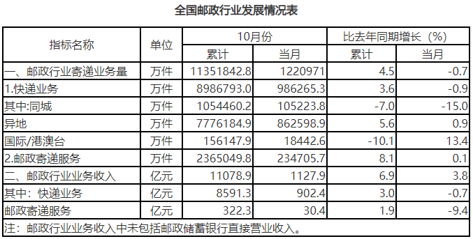 据国家邮政局数据显示,10月份邮政行业寄递业务量完成122.1亿件,同比下降0.7%。其中,快递业务量完成98.6亿件,同比下降0.9%;邮政寄递服务业务量完成23.5亿件,同比增长0.1%。