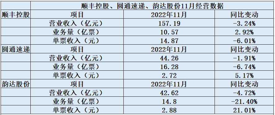 12月20日,顺丰控股、圆通速递、韵达股份一同披露11月经营数据,三家快递公司上月营业收入均出现下滑。