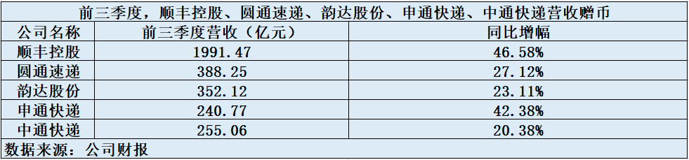 根据财报显示,前三季度,顺丰控股、圆通速递、韵达股份、申通快递、中通快递分别录得营收为1991.47亿元、388.25亿元、352.12亿元、240.77亿元、255.06亿元,同比增长幅度分别为46.58%、27.12%、23.11%、42.38%、20.38%。