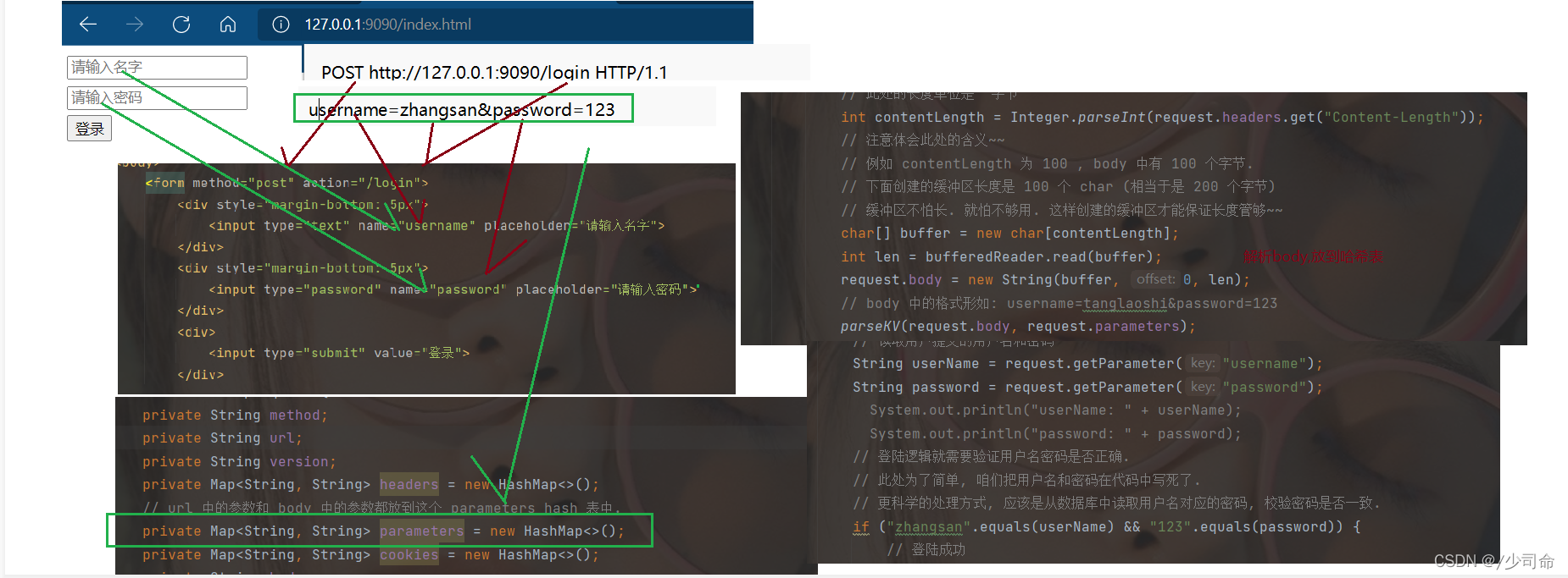 对照着 HTTP 请求的格式, 创建属性: method, url, version, headers. 创建 patameters, 用于存放 query string 的解析结果. 创建一个静态方法 build, 用来完成解析 HTTP 请求的过程. 从 socket 中读取数据的时候注意设置字符编码方式 创建一系列 getter 方法获取到请求中的属性. 单独写一个方法 parseKV 用来解析 query string