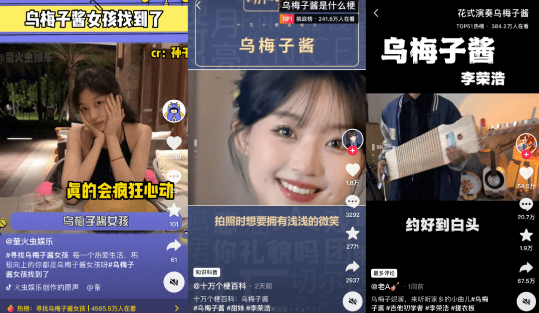 再者,把“乌梅子酱”这个冷门食物(其实就是广东吃烧鹅饭蘸的梅子酱)用作歌名,是能勾起听众探索欲的话题噱头。目前该歌名已在短视频催生出 #乌梅子酱是什么梗#、#寻找乌梅子酱女孩# 等衍生的二创风潮。试想一下,如果这首歌叫芝麻酱,估计姑娘们也不愿意被叫“芝麻酱女孩”吧。