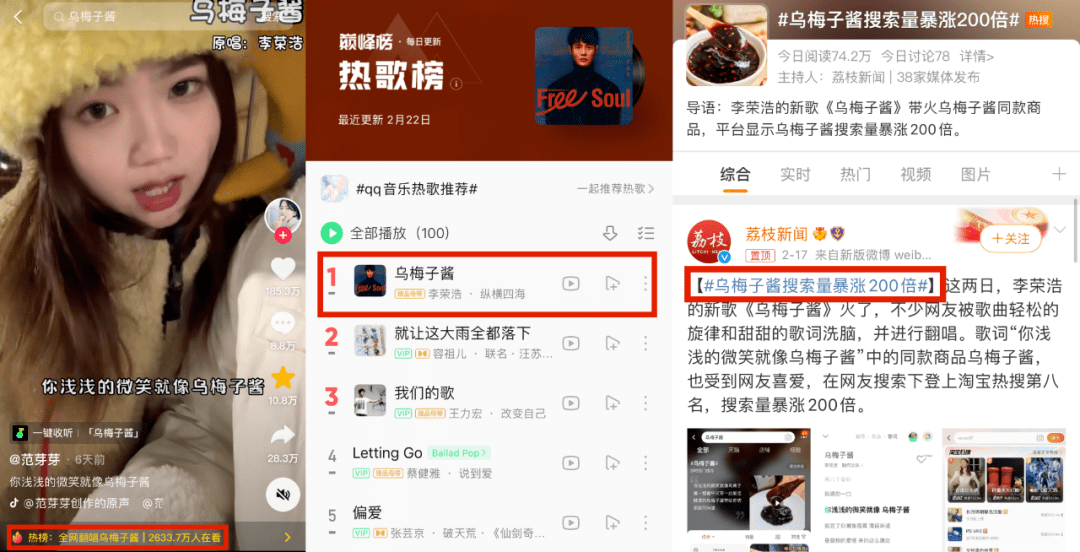 在抖音,《乌梅子酱》被各路翻唱并引发全民热议“乌梅子酱是什么酱”;在QQ音乐、网易云等音乐平台,它也以屠榜姿态攀上了各类热歌榜、飙升榜的TOP1;而作为新晋的“带货神曲”,歌曲引发淘宝上乌梅子酱的相关搜索量暴涨了200倍。