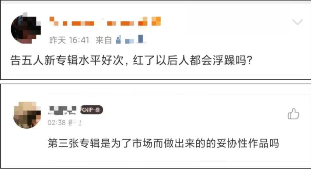 争议也由此而来,22日“毒舌乐评人”丁太升炮轰《乌梅子酱》俗不可耐直接冲上微博热一,似乎讲中了部分乐迷的心声。而另一边,“顶流乐团”告五人刚发的新专《带你飞》同样广泛遭到抖化、俗化的指责,尽管这张专的不少歌曲依然风靡短视频。
