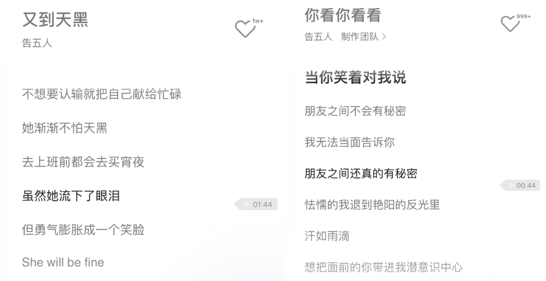 而在犀牛君看来,《带你飞》或许不如前两专惊艳,但也绝不是敷衍之作,《又到天黑》《远距离恋爱》都是基于对时代症候的敏锐洞察所写的抚慰人心之作,很适合做温情短视频的BGM;而《啊我忘了带伞》《你看你看看》诙谐而意外的叙事方式也很告五人,个中歌词亦有被短视频广泛传播为“金句”的潜质。