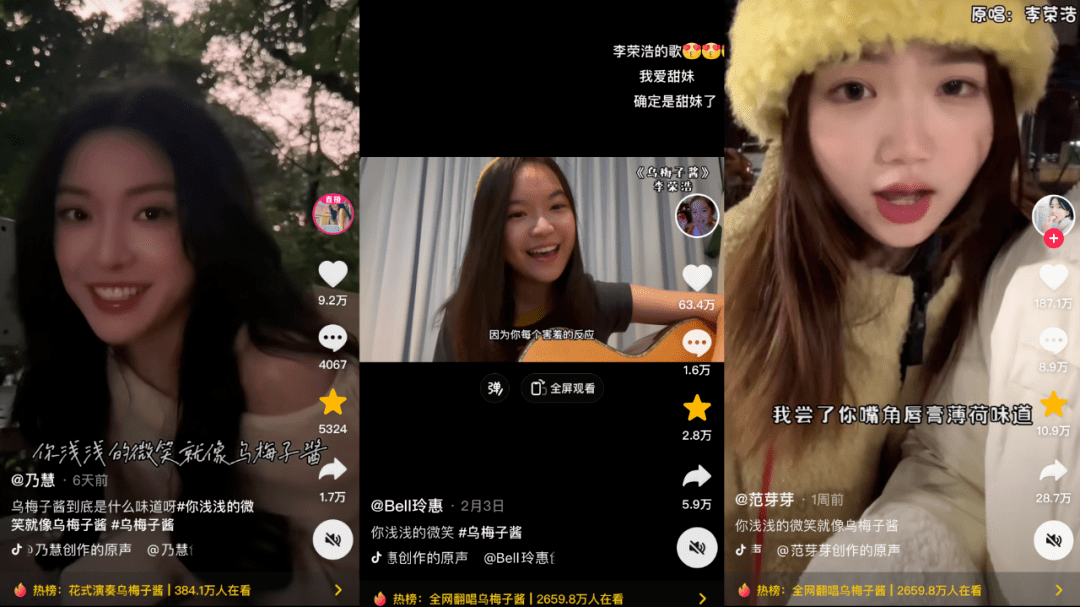 一个很关键的时间点是不久前的情人节(2月14日),作为恋爱“小甜歌”的《乌梅子酱》被范芽芽(1693.8w粉)、乃慧(1256.1w粉)、Bell玲惠(5922.5w粉)等人气音乐博主们接力翻唱,短时间点燃了“全网翻唱”的二创热潮。