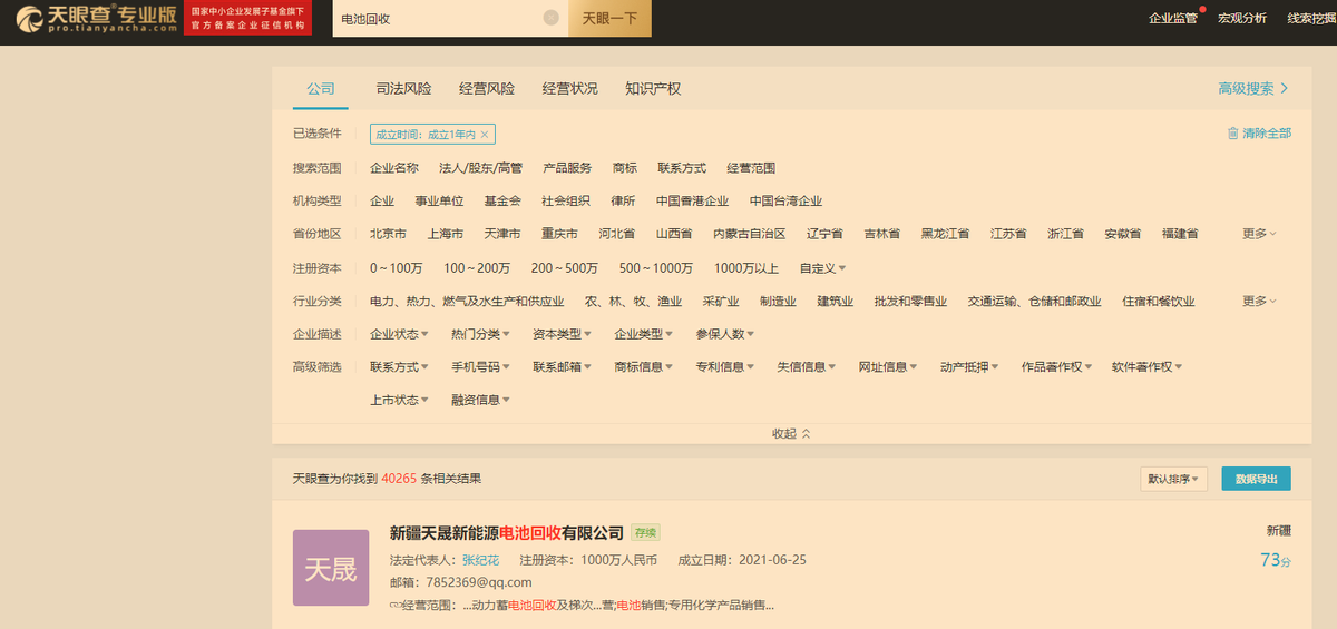 天眼查APP信息显示,今天搜索电池回收关键词,已经存在88244条相关结果,其中仅成立一年内的企业,就已有高达40265条相关结果,占到了近乎半数。
