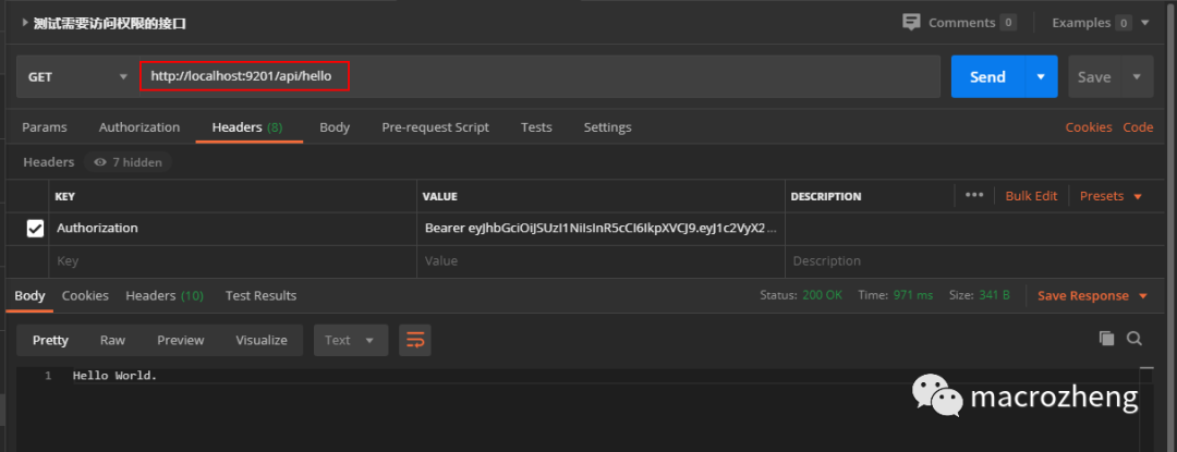 - 使用获取到的JWT令牌访问需要权限的接口,访问地址:http://localhost:9201/api/hello