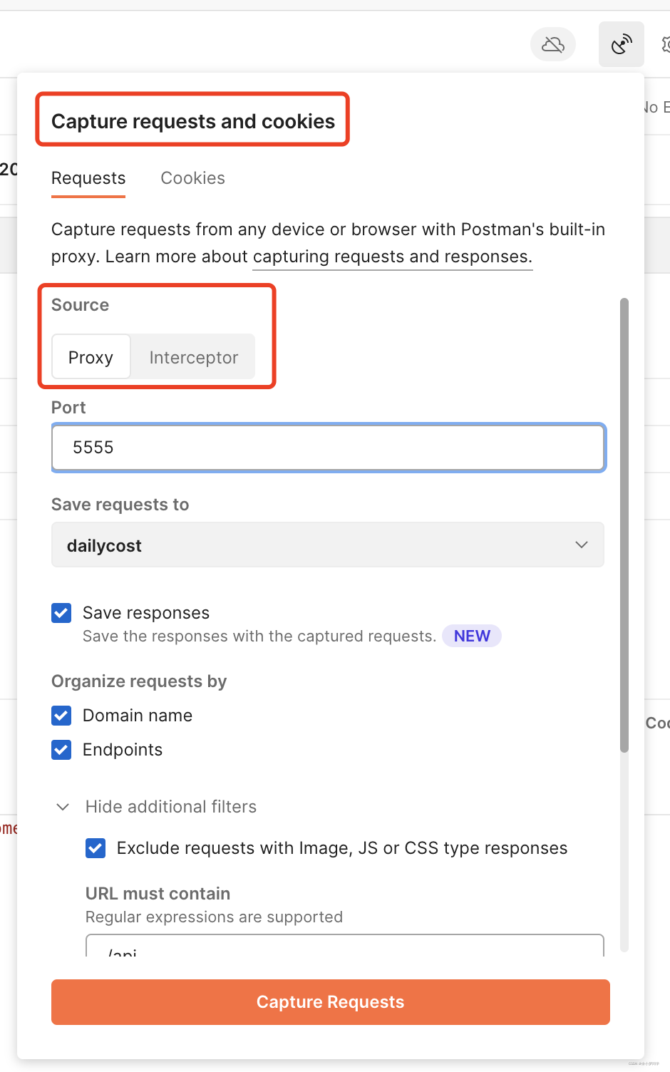状态,Postman就可以将符合过滤条件的请求拦截并存储在设定好的collection中。