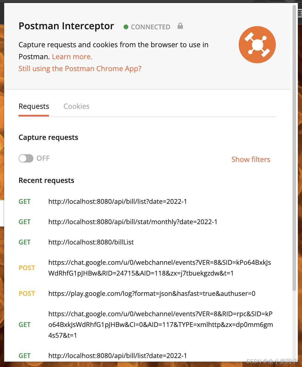 先在浏览器中安装Postman Interceptor,Postman中也要安装Interceptor Bridge,准备就绪后,可以看到