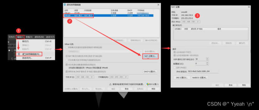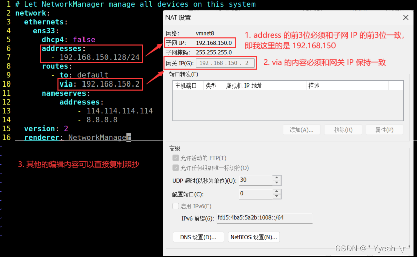 1). address 的内容前3位必须和编辑 -> 虚拟网络编辑器 -> VMnet8 NAT模式 -> NAT设置中的子网 IP 的内容前3位保持一致,即我这里的是 192.168.150;