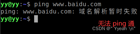 此时我们尝试命令 ping www.baidu.com 会出现如下情况:无法 ping 通。说明网络确实出现了问题。