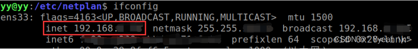 2. 再次输入 ifconfig 命令查看网卡情况,出现如图信息,说明我们启用 ens33 网卡成功了。注:但此时网卡还没有正确配置成功
