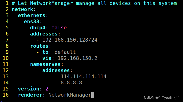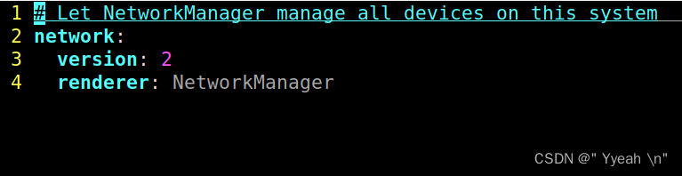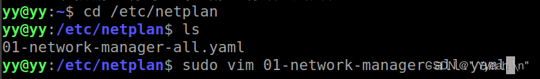 3. 启动网卡成功后,我们切换 cd /etc/netplan 目录,然后我们使用命令 sudo vim 01-network-manager-all.yaml 编辑该目录下的 .yaml 文件。