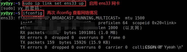 1. 首先输入命令 sudo ip link set ens33 up 来启用ens33 网卡。