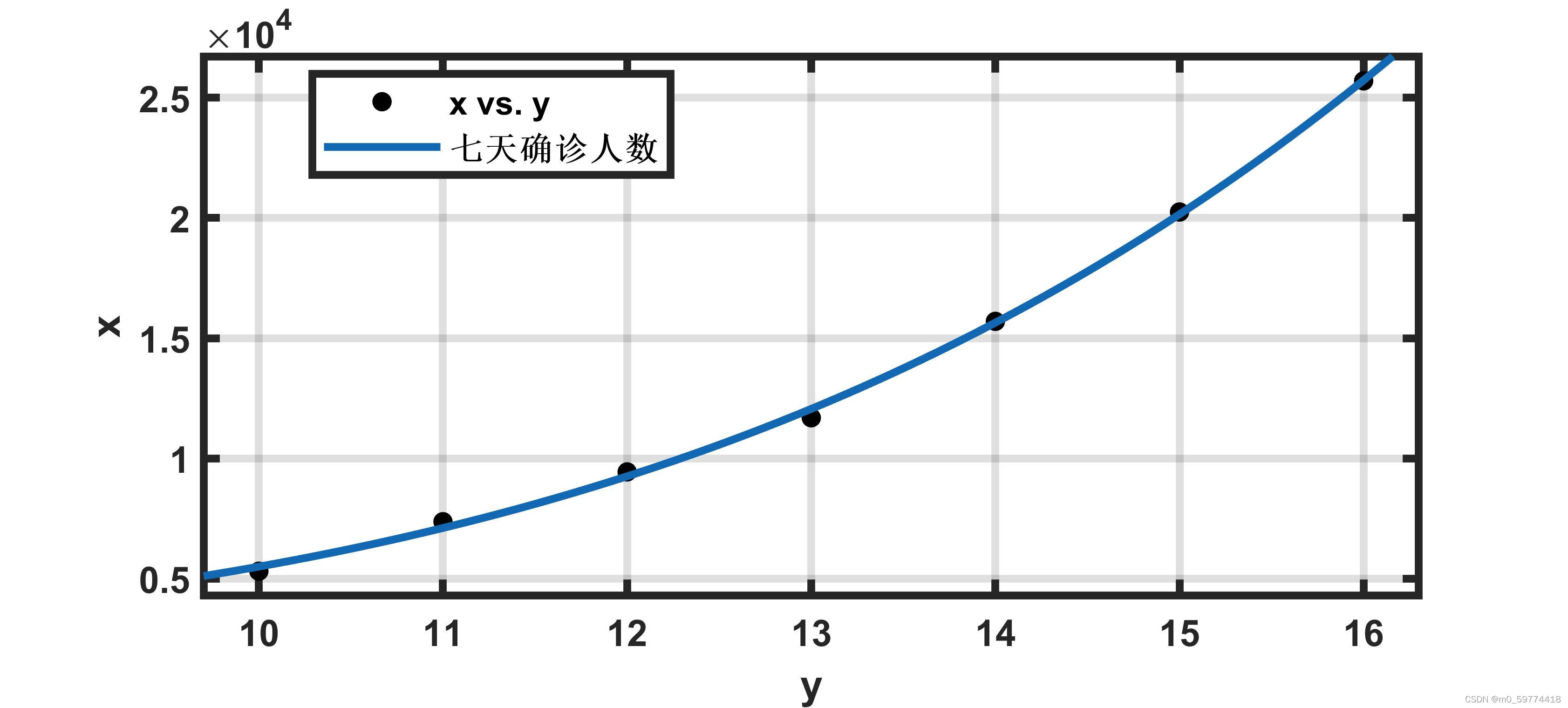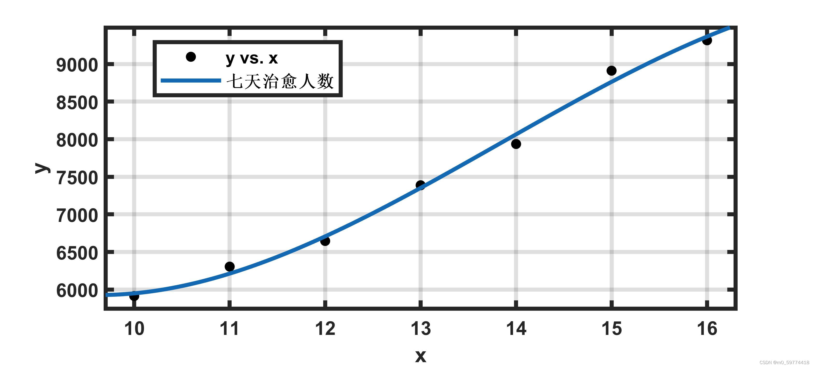 对于模型的求解,我们需要拟合六个参数:即易感者初始值S(0),潜伏者初始值E(0),传染率β,潜伏率a,康复率。查找近七天的数据,运用MATLAB拟合工具箱对数据进行拟合。