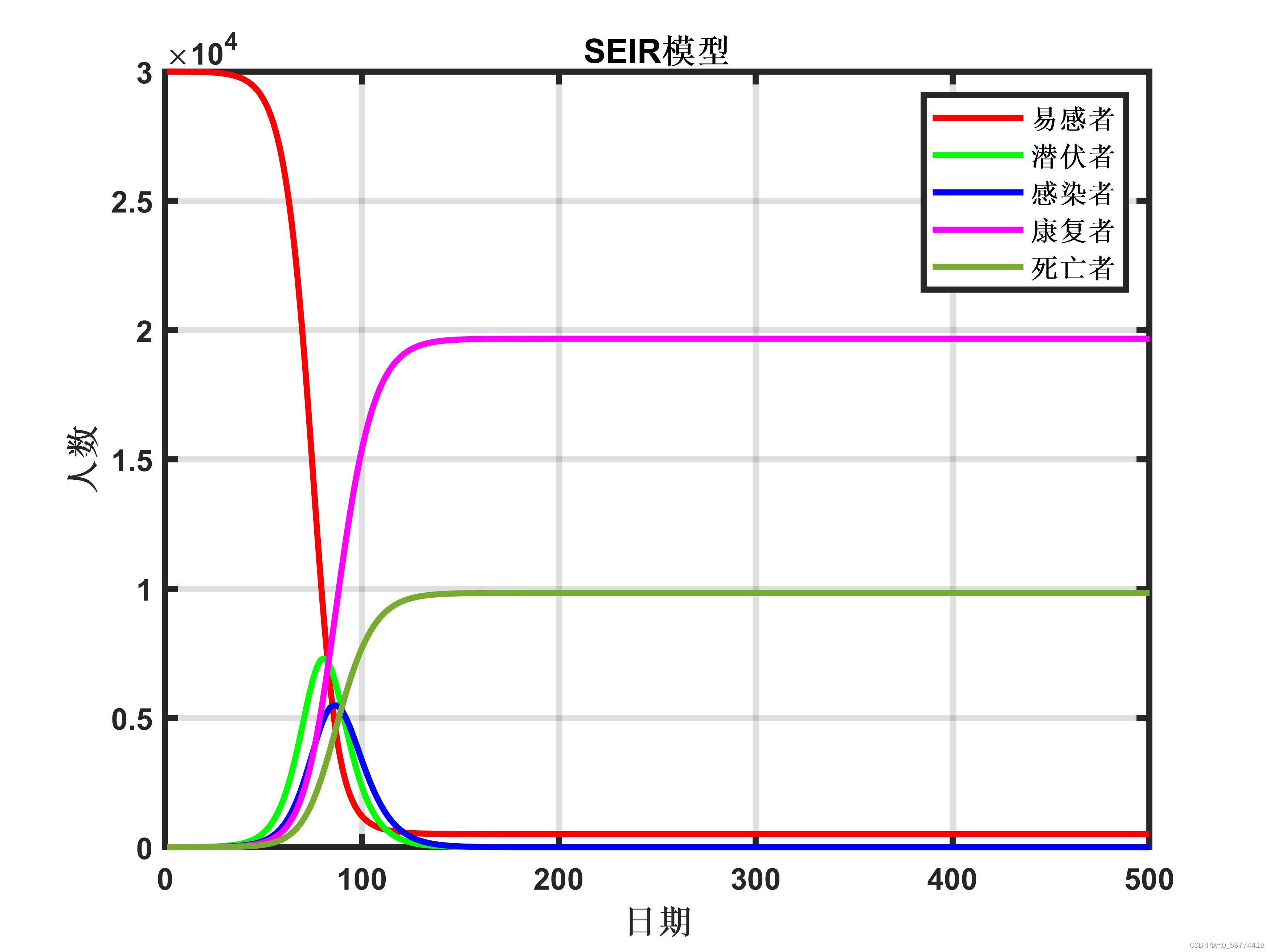 S(t)的意思是第t天健康个体的数量,E(t)是第t天接触过感染者的个体数量,I(t)是第t天感染个体的数量,R(t)是第t天免疫个体的数量,N(t)是整个种群的数量,在假设情况下固定不变为N,取。