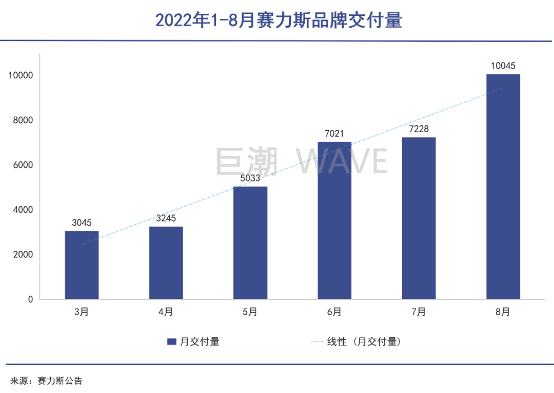 8月份,赛力斯与华为合作的问界品牌交付10045量,同比暴增1277.91%;1-8月共交付39433量,同比增长1211.37%,问界由此创造了国内新能源汽车品牌单月破万最快记录。