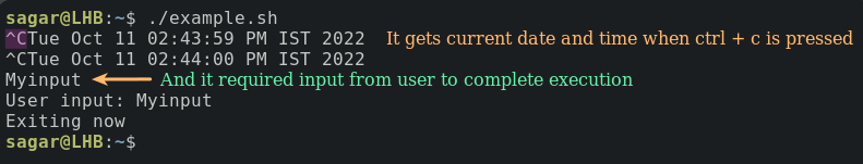 但 SIGINT 也不是万能的,它在某些地方不起作用,比如 bash 解释器中。比如,下面这个 bash 脚本用于接受用户输入: