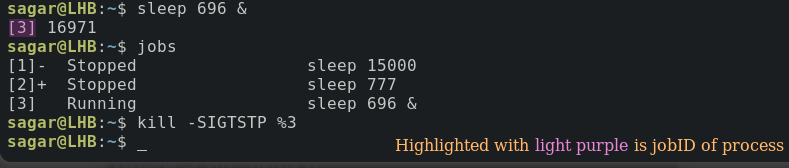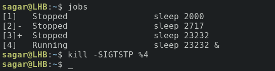 那么,如何终止后台进程呢?需要使用 kill 命令,使用 SIGTSTP 指定 PID 或者 JOBID,如下所示:
