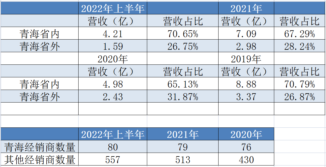 主营业务增长乏力的背后是天佑德酒“被困”青海,摘不掉区域酒企标签的困境,2020年至2022年上半年,除青海外的其他经销商数量由430家增至557家,天佑德酒想要通过增加青海省外的经销商数量来开拓省外市场,但效果并不好,2019年至2022年上半年,青海省内的营收占比分别为70.79%、65.13%、67.29%、70.65%,青海省内的营收占比分别为26.87%、31.87%、28.24%、26.75%,省内营收比例依旧居高不下,省外营收比例难以突破30%。