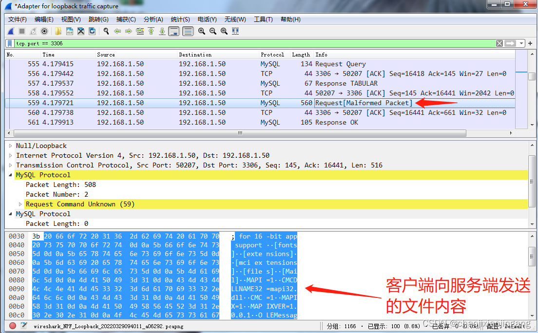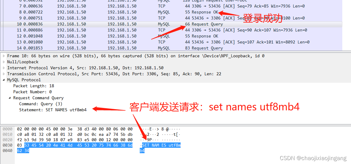 3)然后看到一个Request Query包,客户端发送请求:set names utf8mb4