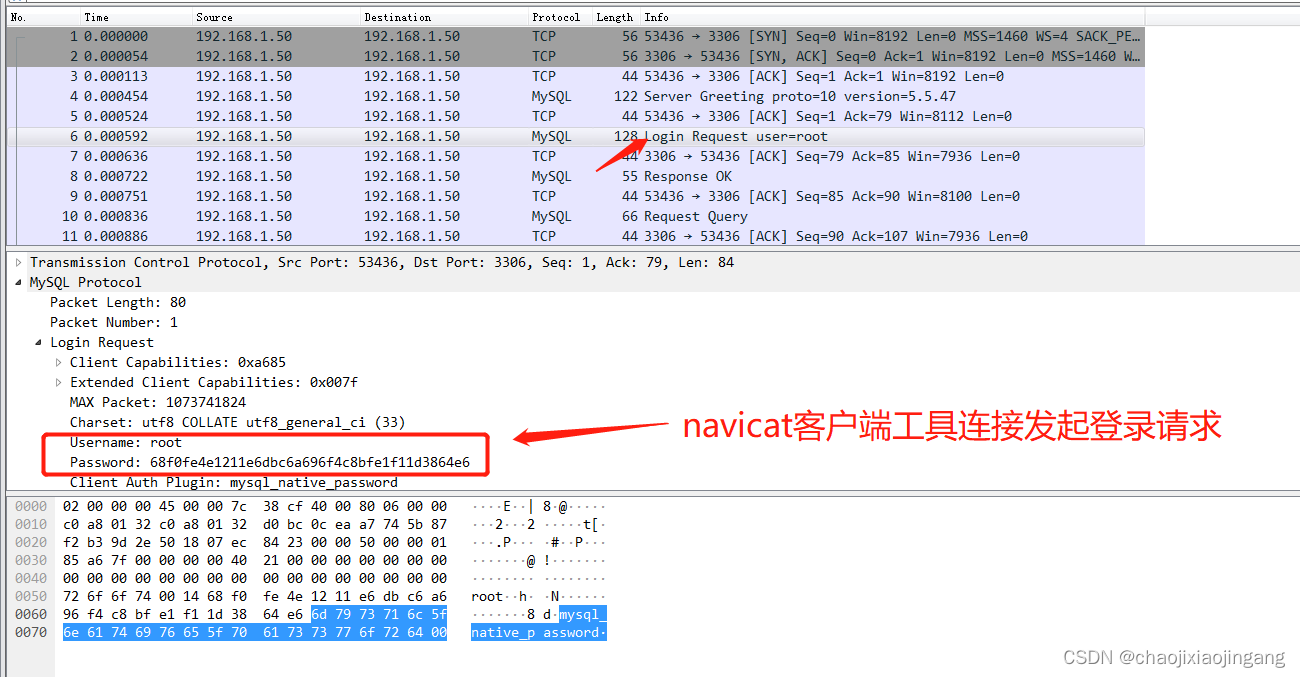 2)使用navicat客户端连接服务端,客户端发起登录请求