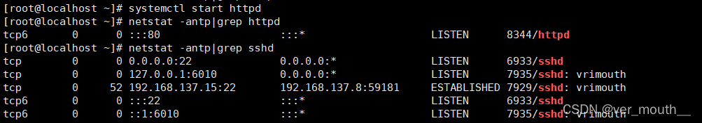 用法:通常使用"-anpt"组合选项,以数字形式显示当前系统中所有的TCP连接信息,同时显示对应的进程信息心配合管道符grep过滤出特定的记录