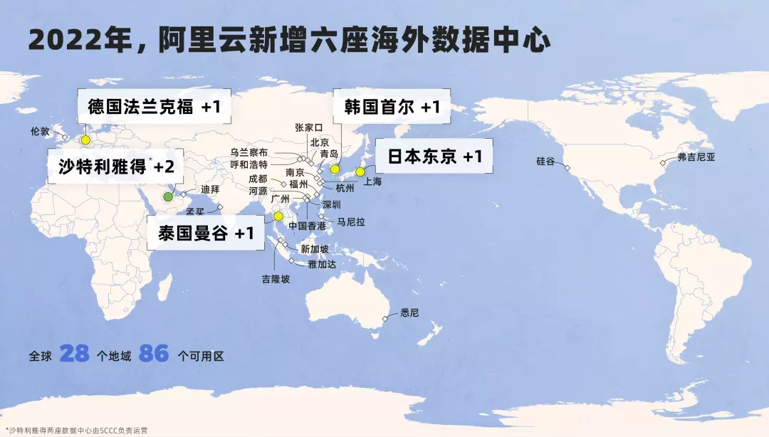 阿里云今年,在泰国曼谷新增数据中心,也是今年新增的第六座海外数据中心,根据阿里云智能国际事业部总裁袁千介绍,2015年,阿里云将国际总部设置在新加坡,通过新加坡覆盖马来西亚、泰国、印尼、日本等全球28个地域和86个可用区。今年,阿里云将数据中台迁至新加坡,并在泰国举办了一年一度的出海云峰会。