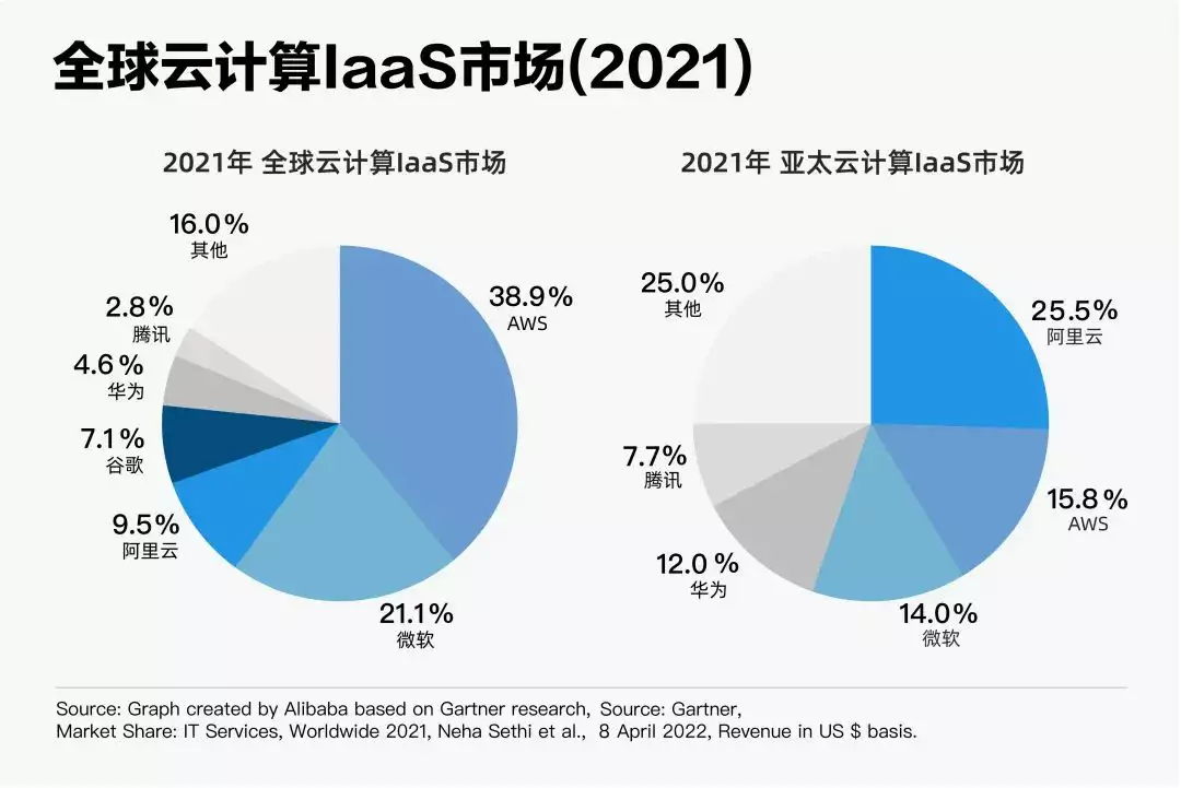 相比之下,腾讯云和华为云仍处于基础设施搭建阶段,业务侧感知不强。根据Gartner数据分析,2021全球云计算IaaS市场,AWS和微软Azure仍处于头部地位,聚焦亚太市场,源于在中国的庞大的市场份额,阿里云居第一,华为居第四、腾讯第五。