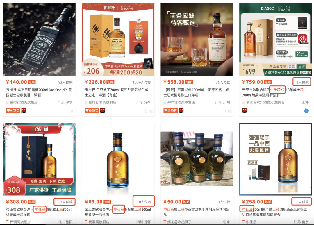 以洋河股份和帝亚吉欧两大巨头高调合作推出的“中士忌”为例。有媒体在此后不久查询帝亚吉欧天猫旗舰店、中仕忌酒业淘宝店发现,中仕忌700ML威士忌月销量为0,帝亚吉欧聚划算平台中仕忌500ML的月销量在“狂欢价”刺激下也只卖出5瓶,这种所谓的“市场期待”确实让人大跌眼镜。时隔两年后,笔者再次检索帝亚吉欧天猫官方旗舰店,中仕忌的页面下是尴尬的“月销1”。