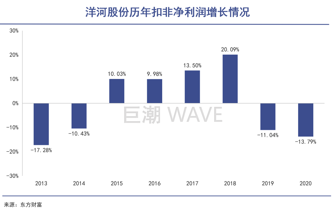 例如对于洋河股份来说,虽然它号称要矢志打造“中国的帝亚吉欧”,但相对于正牌帝亚吉欧而言,洋河股份的产品线略显单调,而且经营业绩颓势隐现。2020年,营业收入约为211.01亿元,同比下降8.76%;净利润约为74.82亿元,同比略增1.35%;基本每股收益盈利约4.98元,同比增长1.74%。