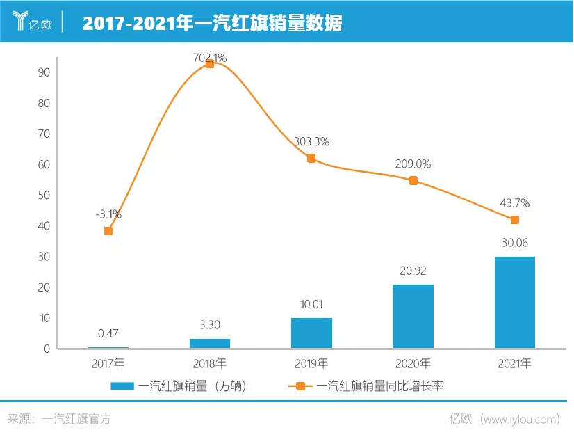 当时间走到2021年,一汽红旗年销量再次同比上涨50%至30.06万辆,将凯迪拉克、雷克萨斯、沃尔沃等一众豪华品牌远远甩在身后。这一销量数据也较徐留平到来的2017年增长了65倍。