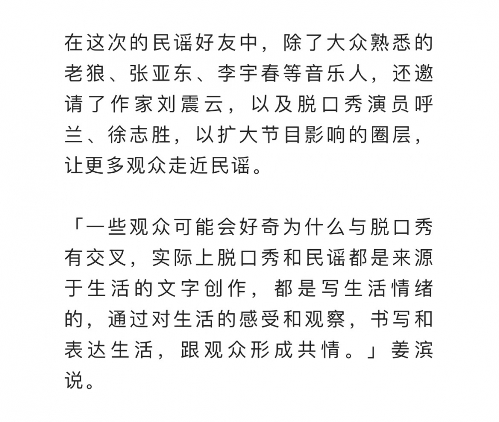 早在《民谣》录制之初,就已经开始被乐迷们催播。有人直言,这是内地民谣人用了28年终于等来的首档专属音综。