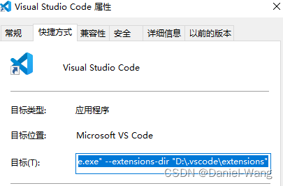 修改目标处内容,在原内容后添加:**--extensions-dir 新插件位置**。如下例: