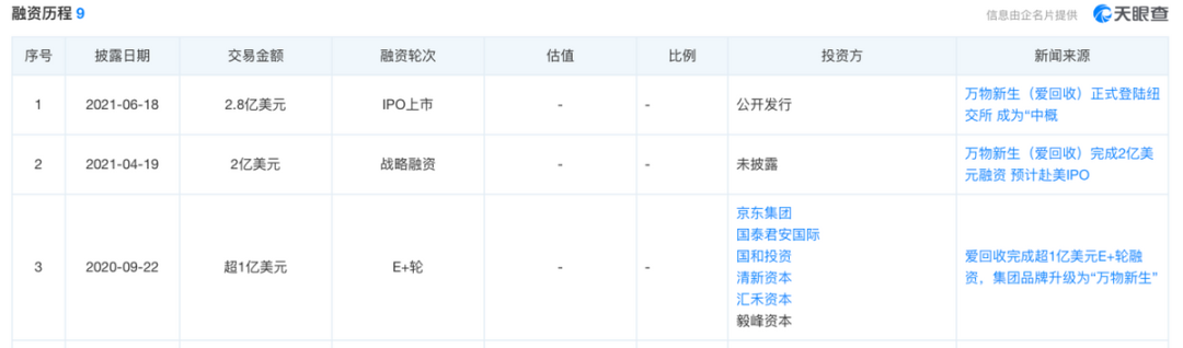 在资本市场上,爱回收融资的轮次已经不少,从2011年公开的A轮融资,到2021年的IPO上市,投资人已经给了足够多的机会。天眼查APP融资信息显示,算上赴美上市前的融资以及上市筹资,爱回收一共拿到了4.8亿美元。