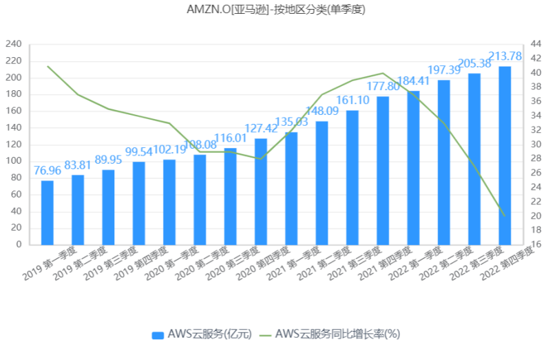 在此背景下,亚马逊云业务增速出现了明显的放缓迹象。2022年Q1-Q4,亚马逊云营收增速分别为37%、33%、27%和20%,营收增速持续创出2014年以来新低。此外,第四季度亚马逊云业务运营利润为52.05亿美元,也低于上年同期的52.93亿美元。