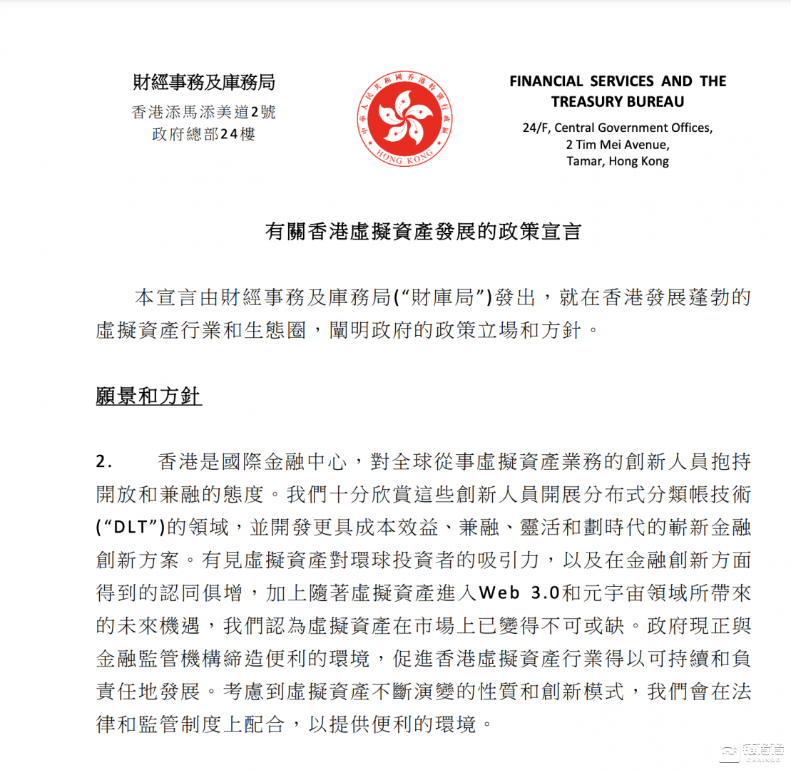 以下为《有关香港虚拟资产发展的政策宣言》原文: