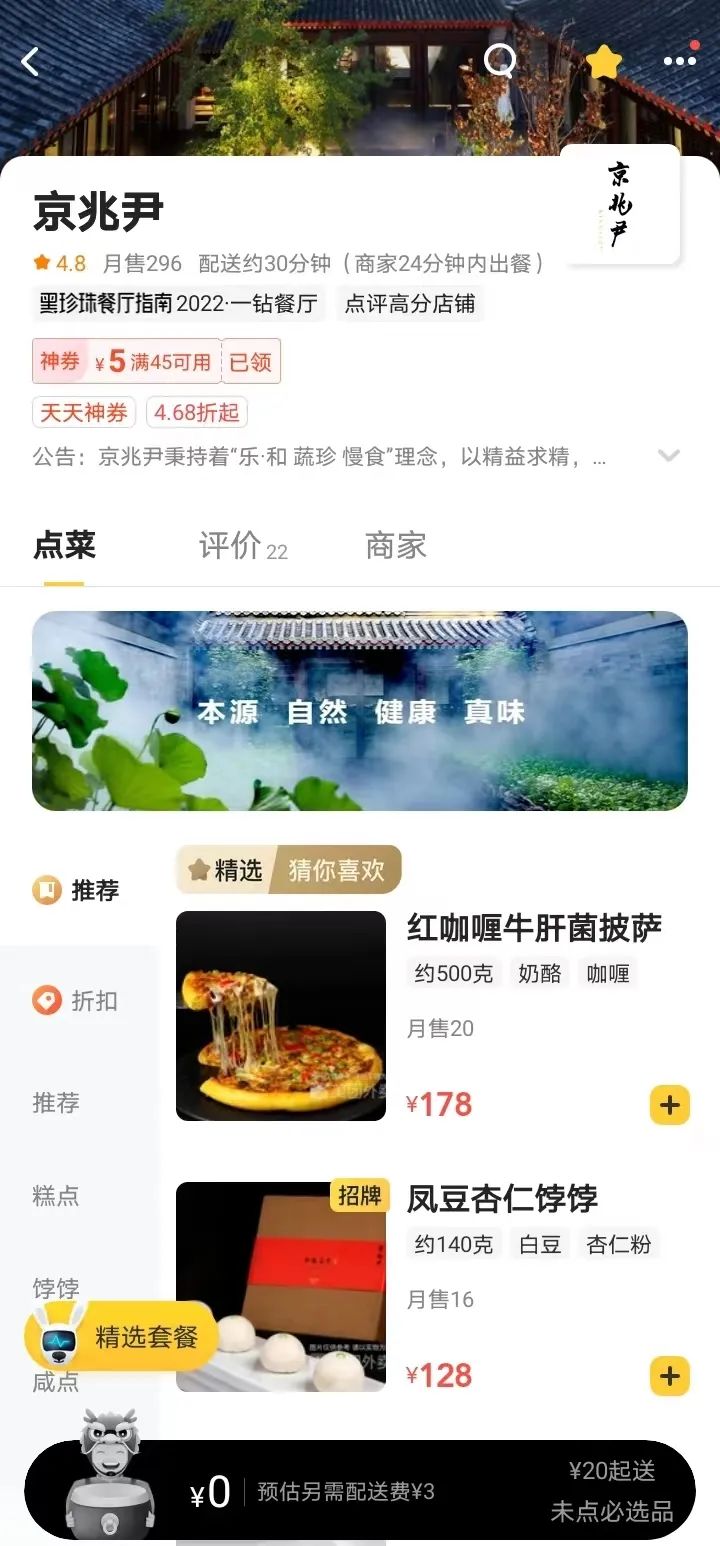 外卖新商家的名单,甚至包括全球唯一的米其林三星素食餐厅京兆尹。这家坐落于北京雍和宫对面,人均价格超过1000元的餐厅,在5月中旬上线外卖,主要售卖主食、自制糕点和300到600元的套餐。