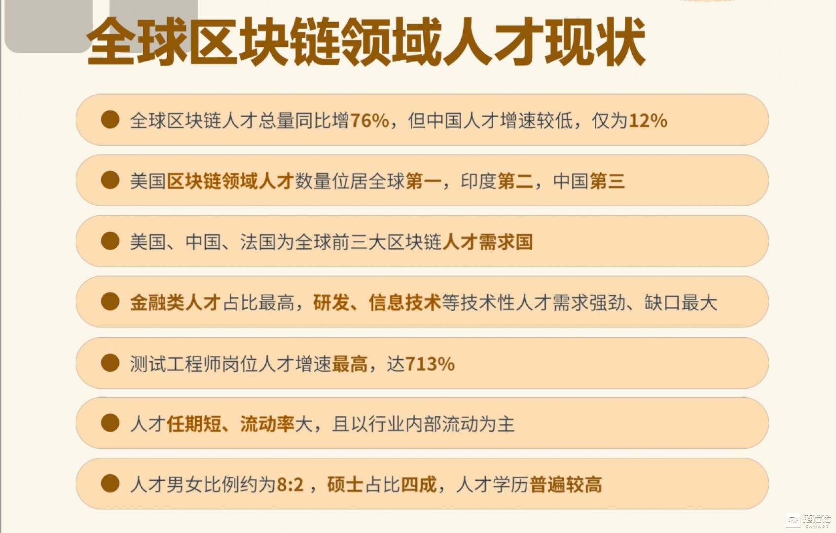 7/人才薪酬:除热门岗位外,区块链产业人才薪酬也备受关注,由于全球Web3人才在整体上供不应需,所以区块链专业人士的薪水正在飙升。据Glassdoor报告称,美国区块链开发人员的平均基本工资为91,715 美元/年。中国市场而言,据《2021年北京市人力资源市场薪酬大数据报告》显示,在30个新职业薪酬排行榜中,区块链工程技术人员最高,年度薪酬中位值达487,106元人民币;工业和信息化部人才交流中心2021年12月发布的《区块链产业人才发展报告》也显示,区块链行业整体年薪逐年上涨,从不同岗位薪资来看,核心研发岗位薪酬最高;其中北、上、广、深等重点城市区块链产业人才平均年薪水平大幅领先城市整体产业人才平均年薪水平。