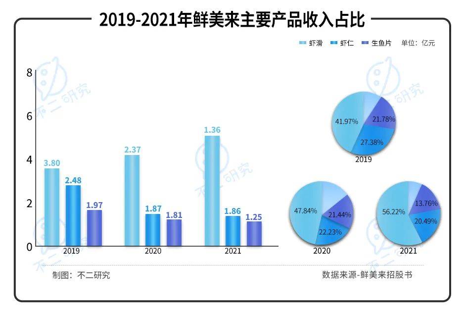 招股书显示,鲜美来的主要产品包括两大类:以虾滑等为主的即烹类预制菜,以虾仁、生鱼片等为主的即配类预制菜。其中虾滑是鲜美来的收入支柱,2019-2021年虾滑的收入分别为3.80亿元、4.03亿元和5.10亿元,占比41.97%、47.84%和56.22%。虾仁和生鱼片紧随其后,2021年分别贡献20.49%和13.76%的收入。