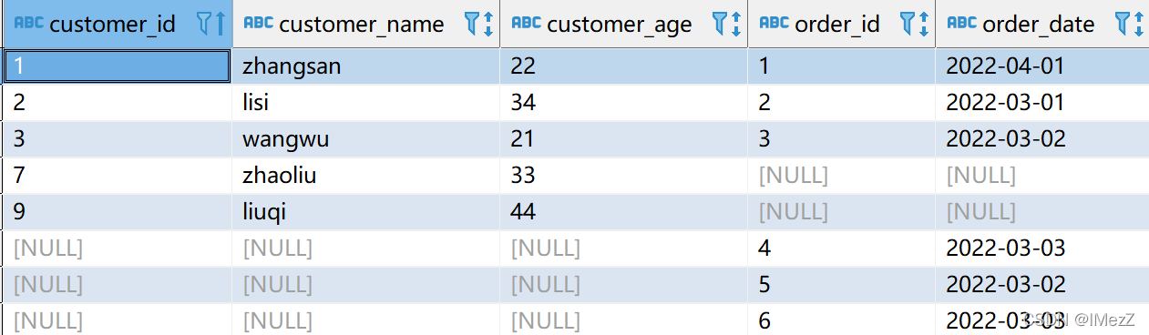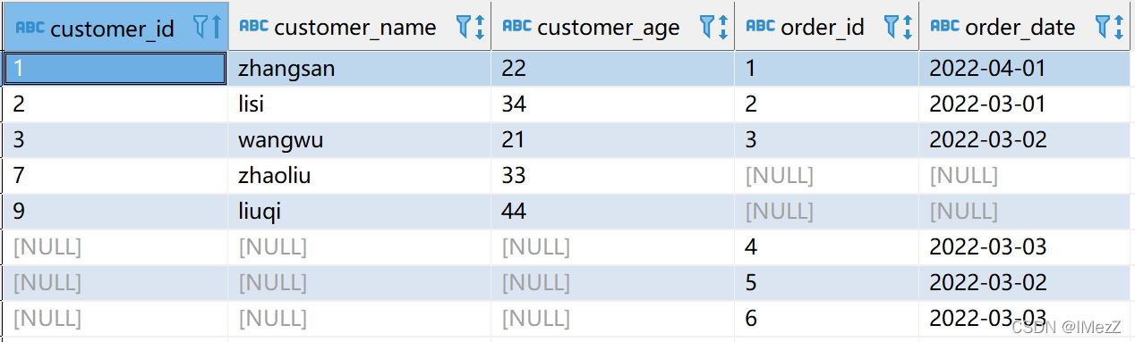 full outer join结合了 LEFT JOIN 和 RIGHT JOIN 的结果,并使用NULL值作为两侧缺失匹配结果。