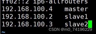 - 修改/etc/hosts 文件(三台虚拟机都需要):vi /etc/hosts ,将slave1和slave2的ip添加到里面(查看IP的命令:ip addr):
