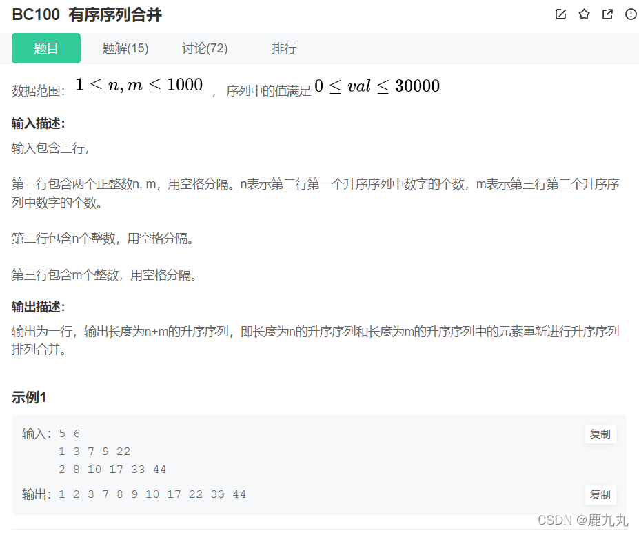 #include<stdio.h> #include<malloc.h> int main() { int n = 0; int m = 0; int all = m+n; int i = 0; //输入n和m scanf("%d %d",&n,&m); int *arr1 = (int *)malloc(sizeof(int)*n); int *arr2 = (int *)malloc(sizeof(int)*m); int *arr3 = (int *)malloc(sizeof(int)*(m+n)); //输入两个有序数组 for(int i = 0;i<n;i++) { scanf("%d",&arr1[i]); } for(int i = 0;i<m;i++) { scanf("%d",&arr2[i]); } //合并数组 i = 0; int j = 0; int k = 0; while(i<n&&j<m) { if(arr1[i]<arr2[j]) { arr3[k++] = arr1[i++]; } else { arr3[k++] = arr2[j++]; } } if(i==n) { for(;j<m;j++) { arr3[k++] = arr2[j]; } } else { for(;i<n;i++) { arr3[k++] = arr1[i]; } } for( i =0;i<k;i++) { printf("%d ",arr3[i]); } return 0; }