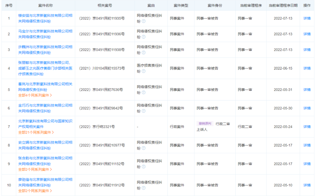 事实上,这并不是新氧首次被明星起诉。天眼查显示,2016年10月以来,包括李小璐、秦岚、许魏洲等90余位明星均因“网络侵权责任纠纷、肖像权纠纷”起诉新氧。