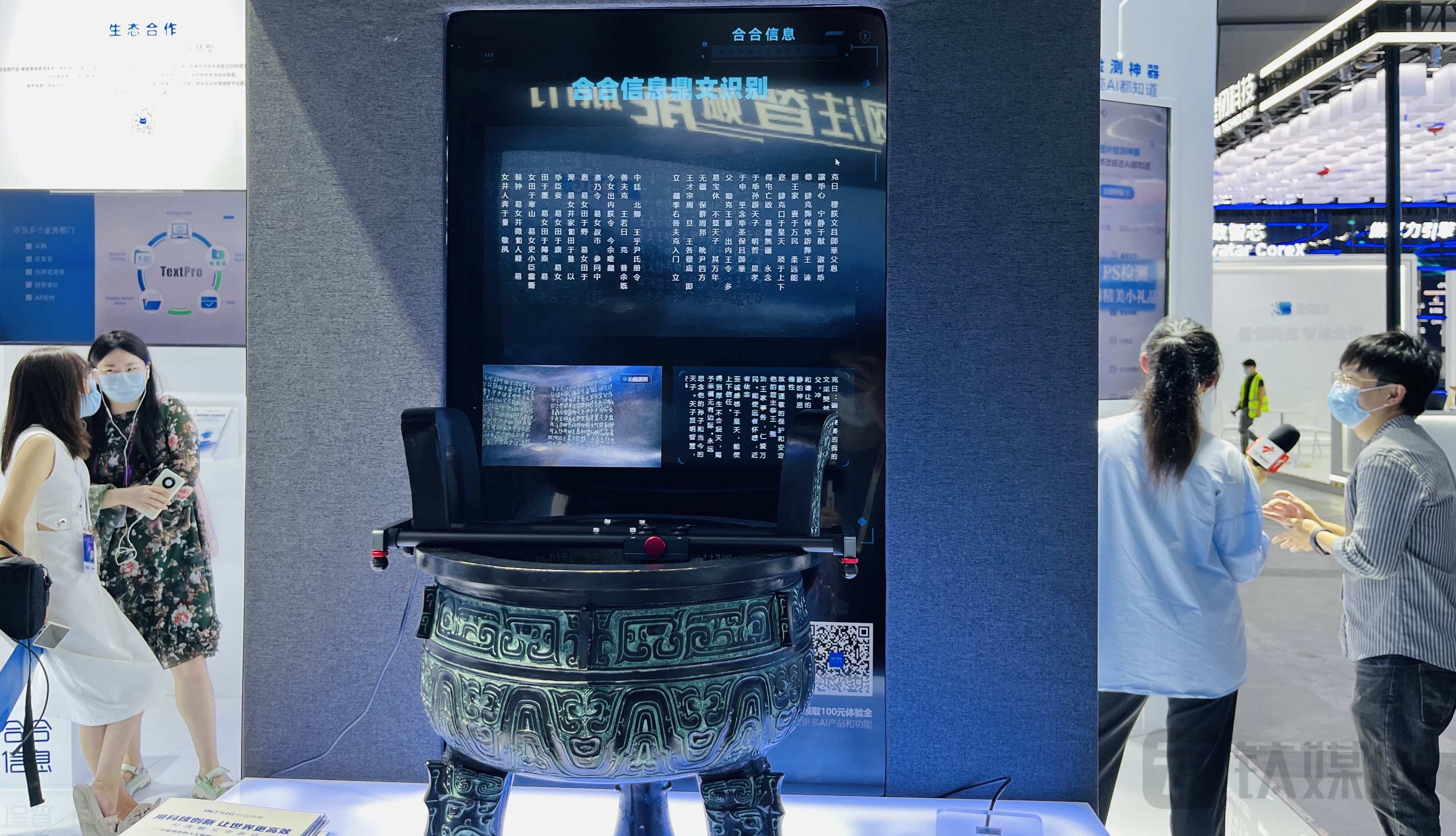 正在进入科创板上市进程的 AI 大数据公司“合合信息”,本届WAIC上展示了鼎文识别能力。据悉,这一方案是利用深度学习的复杂场景文字识别和自然语言处理(NLP)能力,在无人工干预的状态下,将钟鼎文从内凹状态被拉平,并被转译成简体字,原本连在一起的文字经过“AI断句”功能自动处理后被正确区分开来。