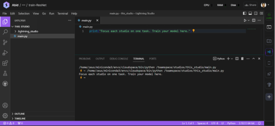 完成初始步骤后,你将看到一个示例项目,包含一个基本的Python文件。在短短几分钟内,你的Studio将准备好处理图像并微调Renest模型。想开始入手,只需编写代码,并执行该文件。