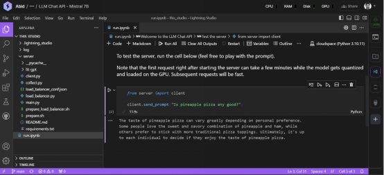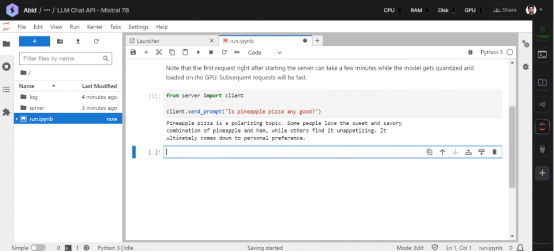 在访问Mistral 7B API之后,代码返回结果。要查看客户端代码,请转到服务器文件夹,打开“client.py ”文件。