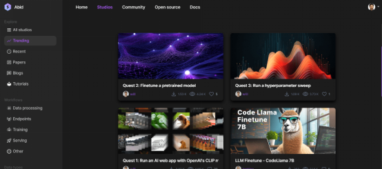 - 可以在几分钟内发现社区模板(Studios),使用你的数据在云端快速部署、微调和训练模型,无需设置。